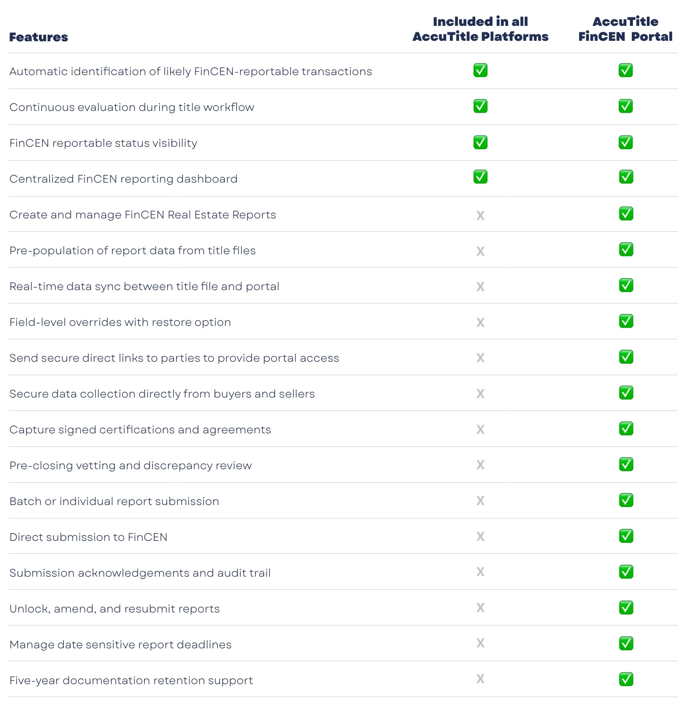AccuTitle combines early identification of reportable transactions with a secure, purpose-built reporting portal, helping title agencies reduce manual work, improve accuracy, and confidently meet FinCEN requirements.